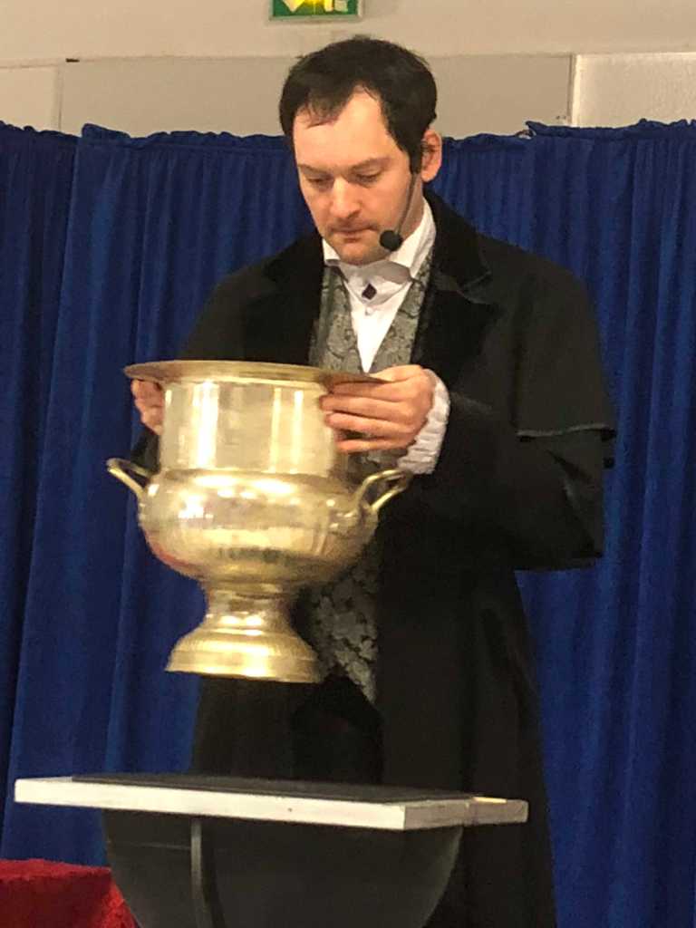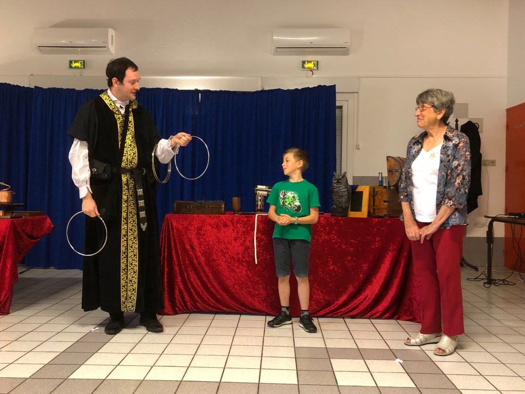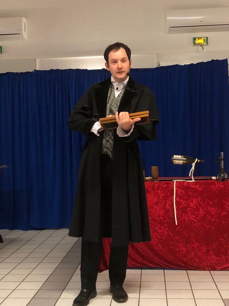 En passant de la préhistoire à l’antiquité, de la renaissance au siècle des lumières, jusqu’à nos jours, le comédien/magicien sur scène nous conte les différents moments importants de ce que l’on appelle aujourd’hui: «la prestidigitation».