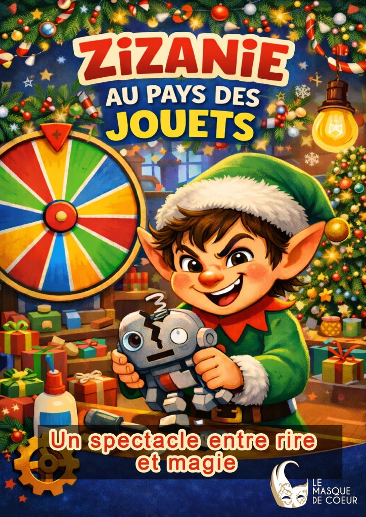 Pour Noël la fabrique de jouet se transforme en atelier du père Noël et le directeur devient le père Noël. L’histoire est la même, mais nous pouvons vous proposer en plus à la fin du spectacle, une animation avec le père noël où les parents peuvent prendre leurs enfants en photo et une remise de cadeau venant de la machine du père Noël remis par lui même.